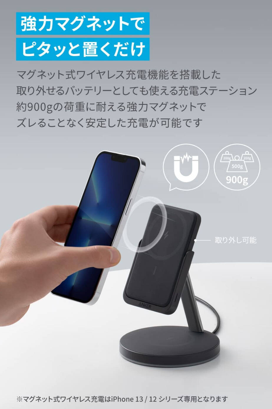 マグネット式のスタンドで、MagSafeに対応したiPhoneをピッタと置くだけで充電が始まります。