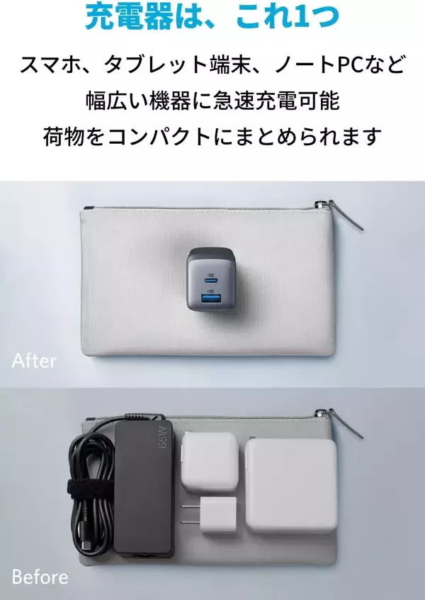 USB-C/Aポート搭載かつ最大65Wの高出力で、iPhoneからMacBook、AirPodsまで幅広いデバイスの充電に利用できます。