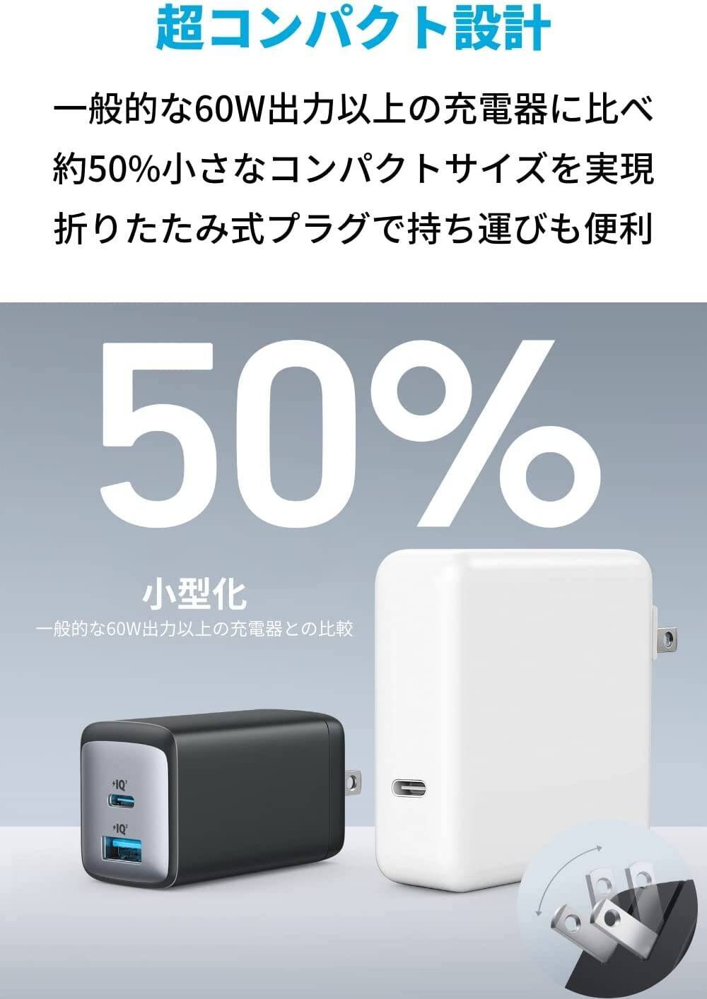 窒化ガリウム(GaN)採用により、一般的な60W出力の充電器と比較して約50%の小型化を実現。