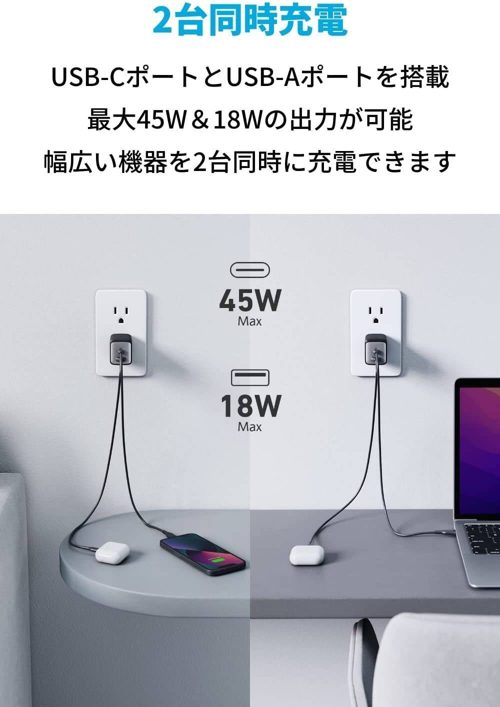 USB-CポートとUSB-Aポートをそれぞれ1つ搭載し、2台同時に充電できます。