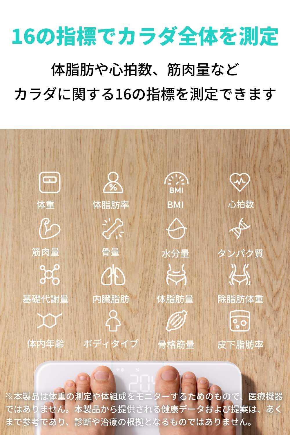 体重・体脂肪率をはじめ、16の指標を測定できます。