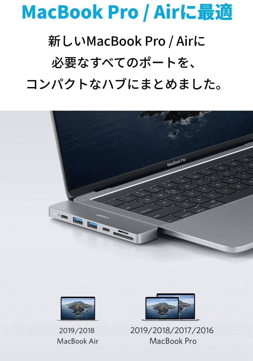7種類のポートをコンパクトにまとめたハブで、これひとつでMacBookの拡張性を格段に高めることができます。