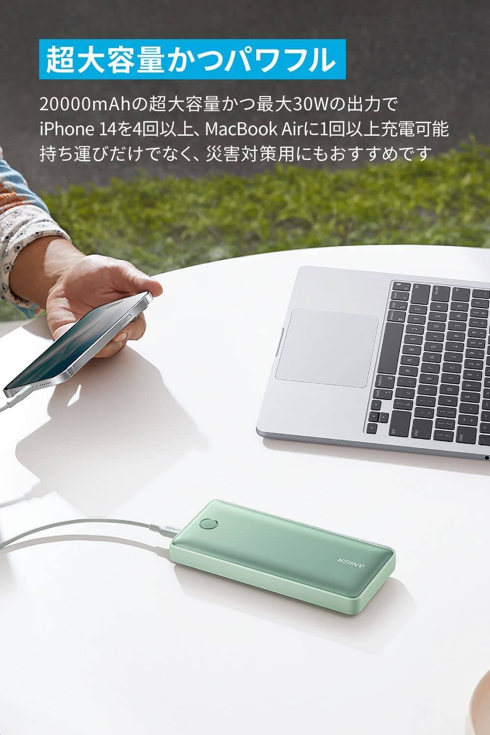 20,000mAhの大容量で、iPhone 14を4回、MacBook Airを1回充電できます。