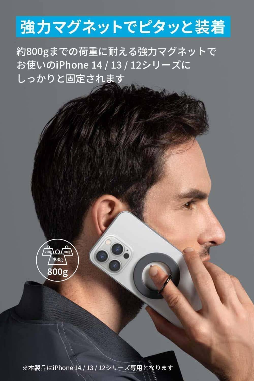 約800gまでの荷重に耐える強力なマグネットを採用したMagSafe対応のiPhone(12・13・14シリーズ)向けのスマホリングです。