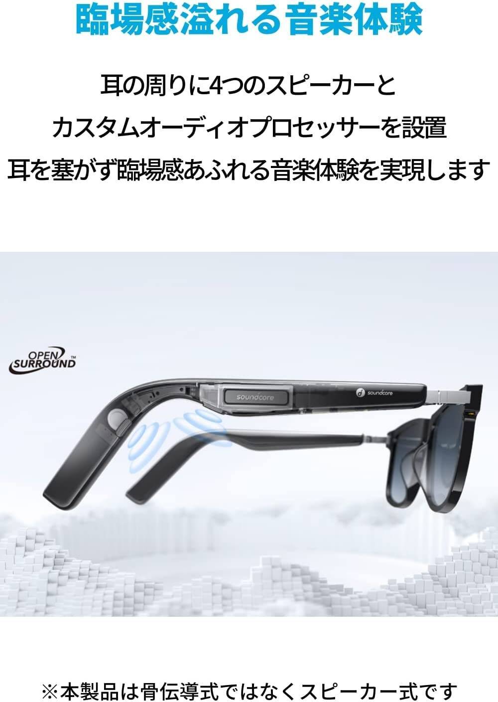 サングラス型のスピーカーという新ジャンルの製品で、主な特徴はつぎのとおり: