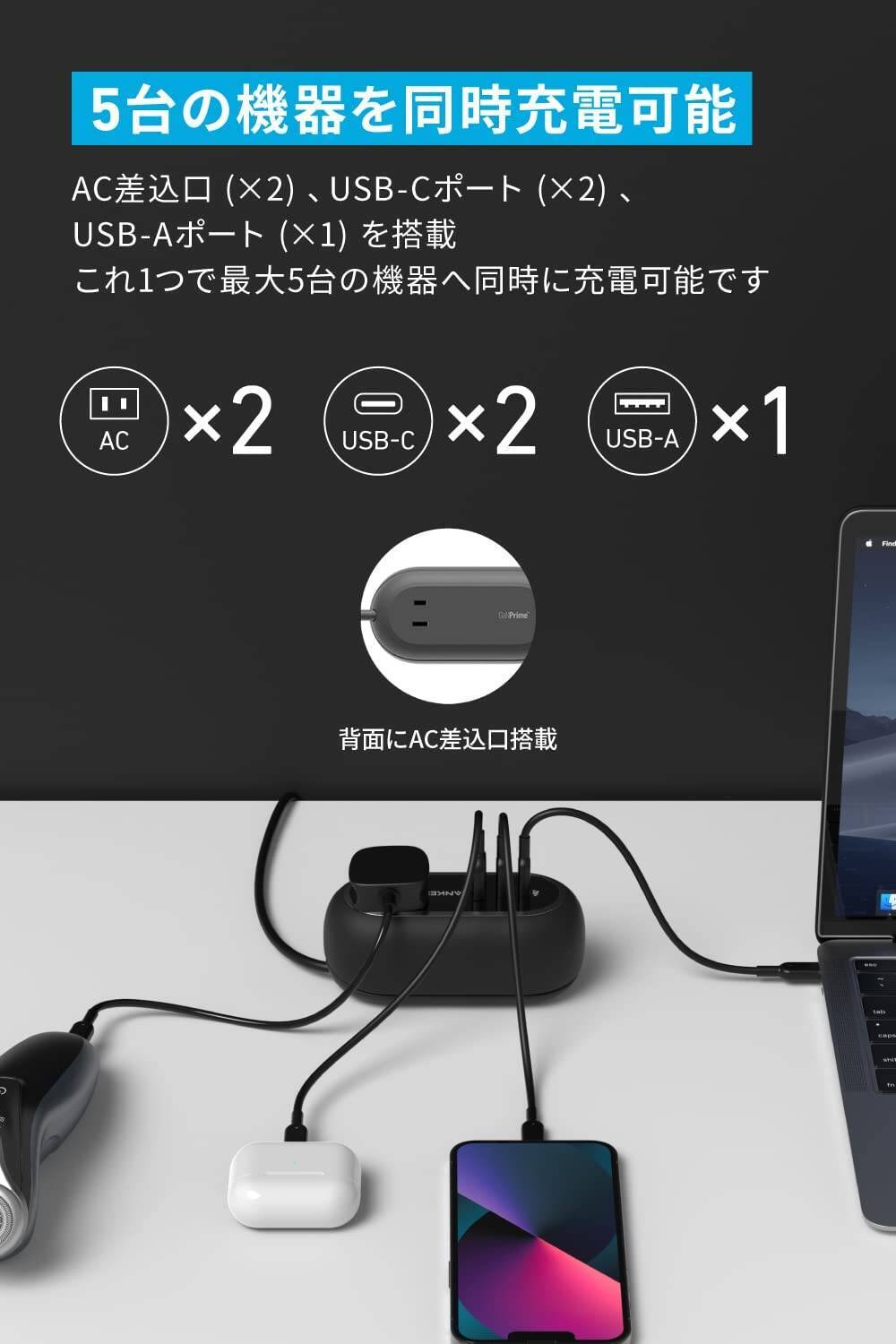 ACx2 + USB-C x 2 + USB-Aを搭載し、5台のデバイスを同時に充電できます。