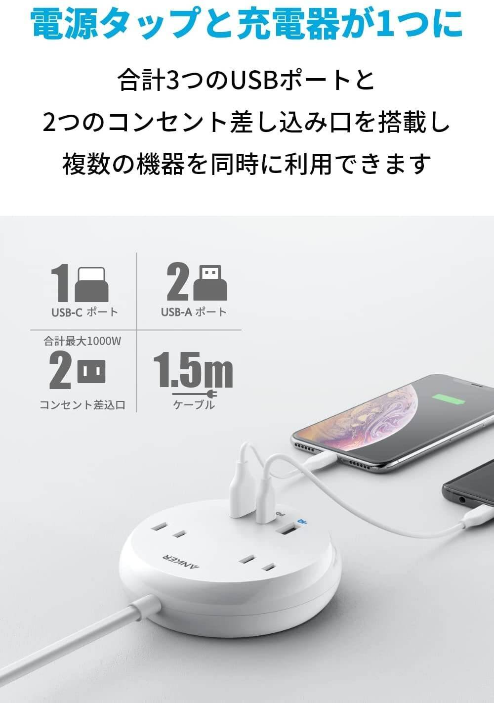 Anker 516 Power Strip(USBタップ 電源タップ コンセント差込口 2口 USB-C 1ポート USB-A 2ポート 延長コ...