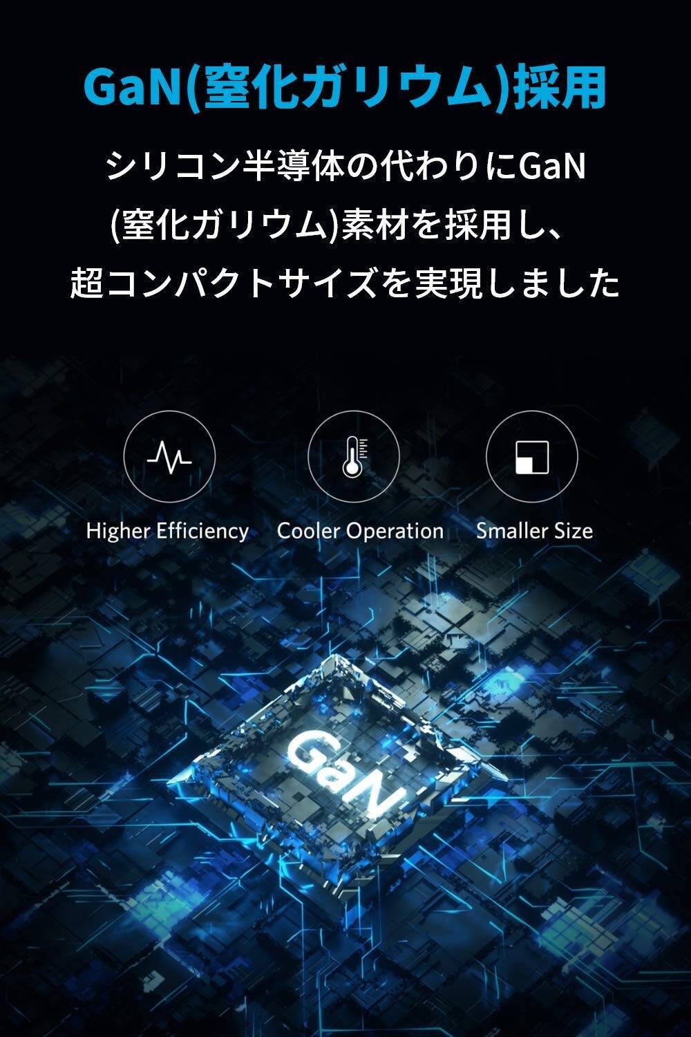 一般的な半導体素材であるシリコン(Si)の約1,000倍の効率とされる、窒化ガリウム(GaN)を採用。