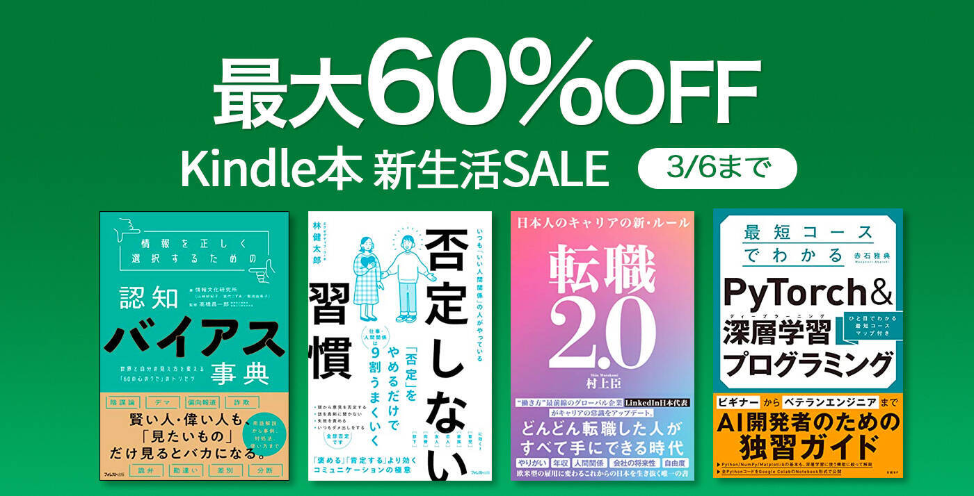 【最大60%OFF】Kindleストアで「新生活SALE」が開催中 (3/6まで)
