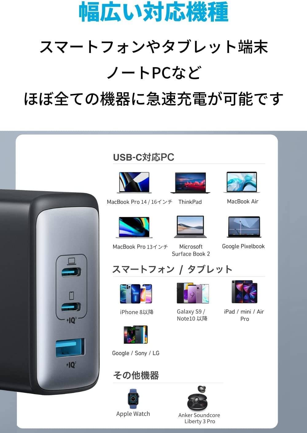 USB-C対応のMacBookからiPhoneまで、幅広いデバイスの充電に対応しています。