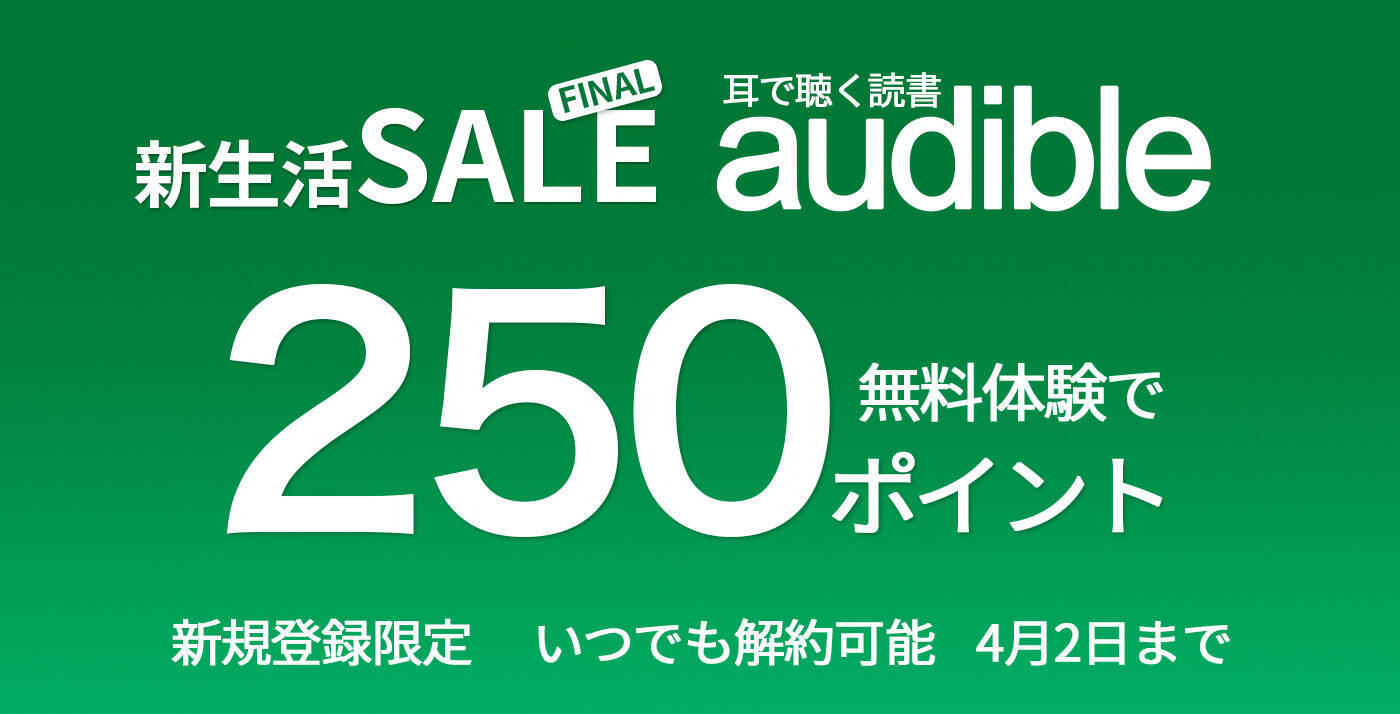 【12万冊聴き放題】オーディオブックAudible「無料体験で 250ポイント」キャンペーンが開催中