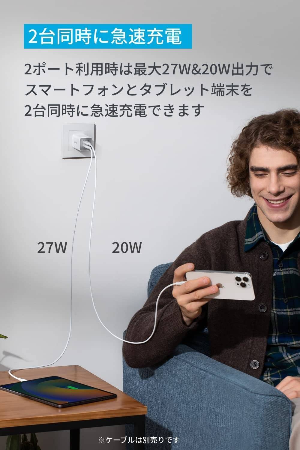 USB-C PD対応のポートを2つ搭載し、最大27Wと最大20Wで2つのデバイスを同時に充電可能。