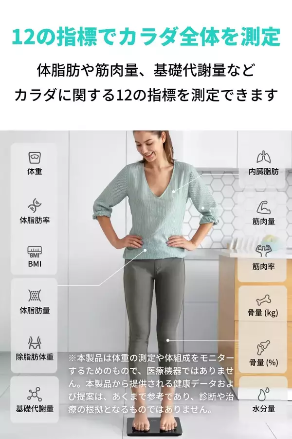体重・体脂肪率・BMI・筋肉量など12項目の指標を測定できます。