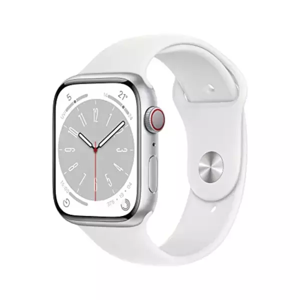 Apple Watch Series 8 GPS + Cellularモデル、45mmケース シルバーアルミニウムケースとホワイトスポーツバンド レギュラーを組み合わせたスマートウォッチ。フィットネストラッカー、血中酸素ウェルネスアプリと心電図アプリ、常時表示Retinaディスプレイ、耐水性能