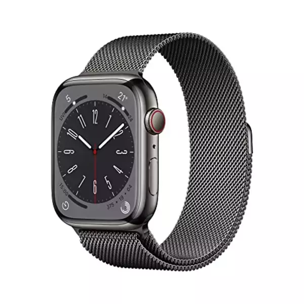 Apple Watch Series 8 GPS + Cellularモデル、45mmケース グラファイトステンレススチールケースとグラファイトミラネーゼループを組み合わせたスマートウォッチ。フィットネストラッカー、血中酸素ウェルネスアプリと心電図アプリ、常時表示Retinaディスプレイ、耐水性能