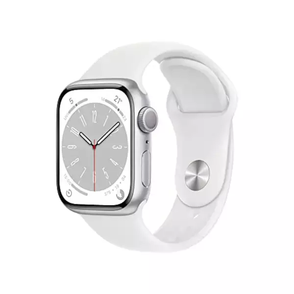 Apple Watch Series 8 GPSモデル、41mmケース シルバーアルミニウムケースとホワイトスポーツバンド レギュラーを組み合わせたスマートウォッチ。フィットネストラッカー、血中酸素ウェルネスアプリと心電図アプリ、常時表示Retinaディスプレイ、耐水性能