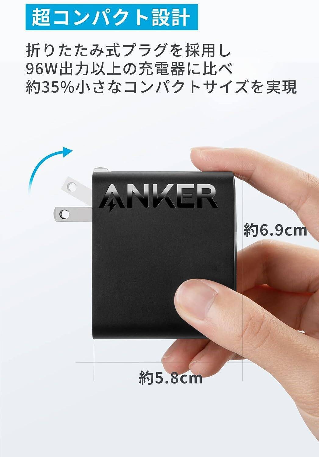 同クラスの充電器と比較して約35%コンパクトなサイズ、かつ折りたたみ式プラグを採用。