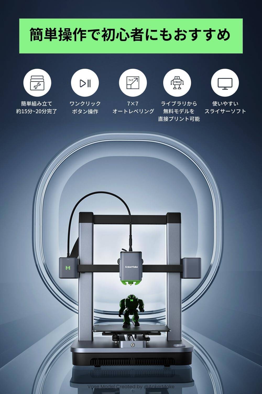 上位モデル「AnkerMake M5」の基本性能はそのままに、タッチスクリーンやAIカメラを省いたモデルで、主な特徴は次のとおり: