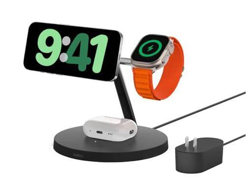 Belkin 3 in 1 MagSafe充電器 最大15W高速充電 ワイヤレス充電器 MagSafe公式認証 iPhone 15 / 14 / 13 / 12 Apple Watch 8/7/Ultra 高速充電対応 AirPodsワイヤレス充電対応 ブラック WIZ017dqBK