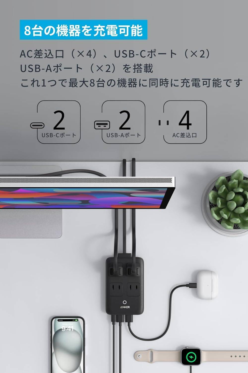 Anker Charging Station (8-in-1, 20W) USBタップ 電源タップ AC差込口 4口 USB-C 2ポート USB-A 2ポート ...