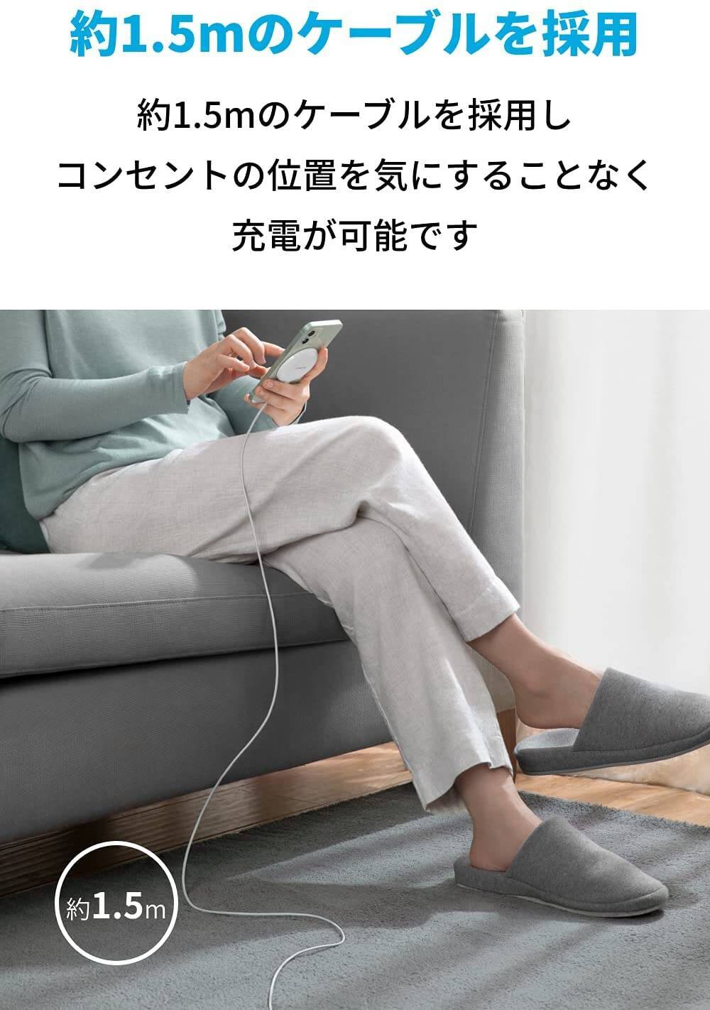 ケーブルは長めの約1.5mあり、余裕を持って充電ができます。