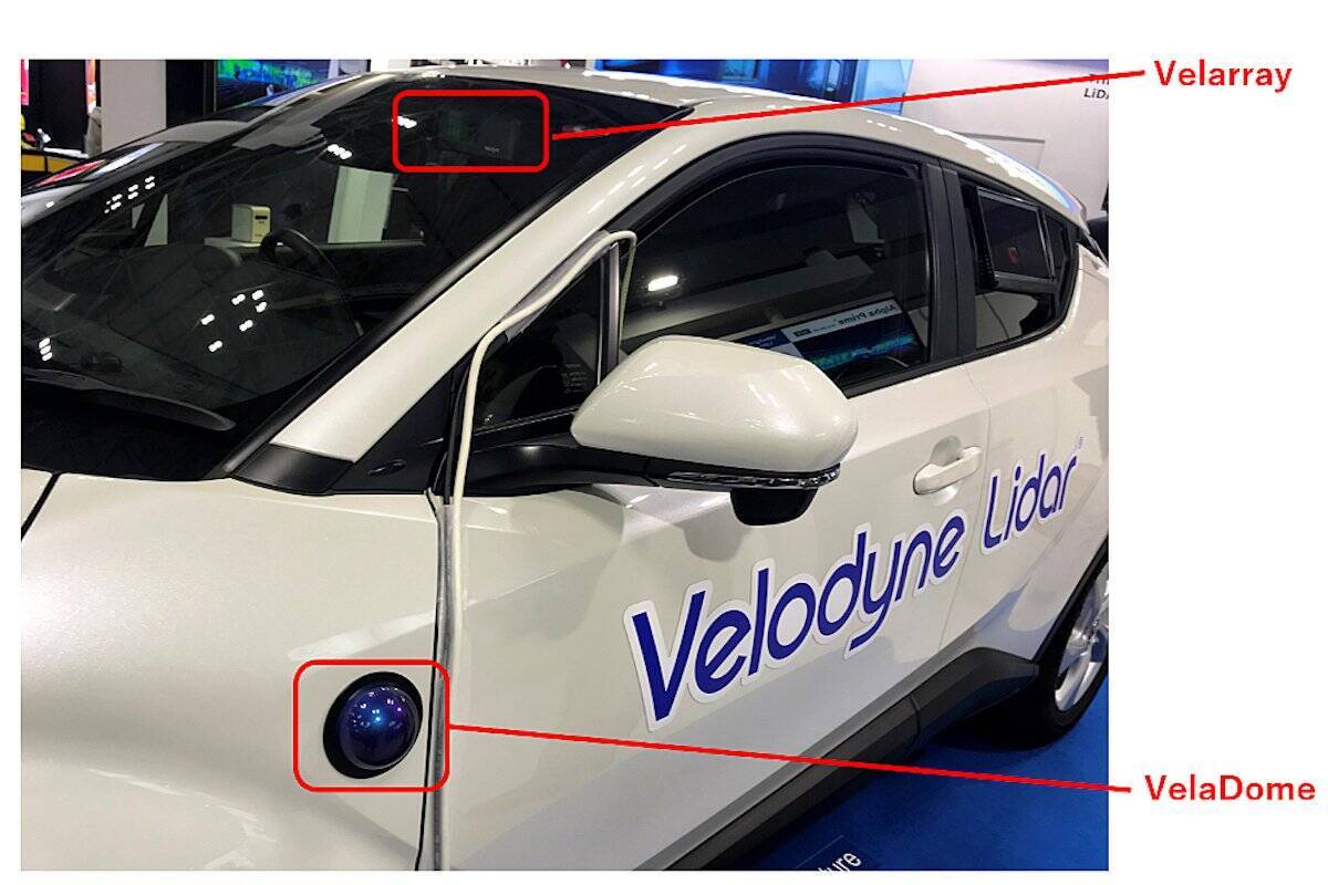 中でも米Velodyneは3D-LiDAR大手として従来から知られており、オートモーティブワールド2020(1月15~17日開催、東京ビッグサイト)では、OEMモデルとして前方用次世代コンパクトLiDAR「Velarray」、側面用180°ドーム型LiDAR「VelaDome」を自動車に搭載したデモ展示を披露していた。実搭載に向けた検討が始まっていることを示唆している。展示したValarrayは車室内フロントのルームミラーなどに設置可能であり、FOVは水平120°、垂直35°(±17.5°)で測定距離は最大約200m。