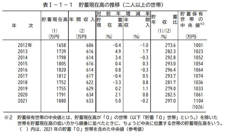 二人以上世帯の貯蓄現在高は1880万円。ちなみに年間収入は633万円です。