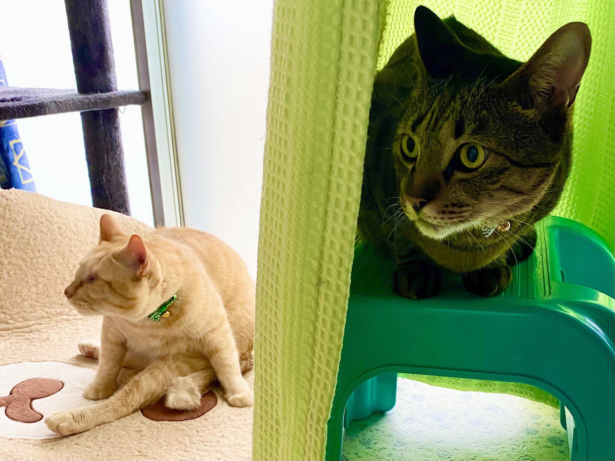 1匹はクッションのようなものの上にいて、もう1匹はカーテン越しにイスの上にいます。