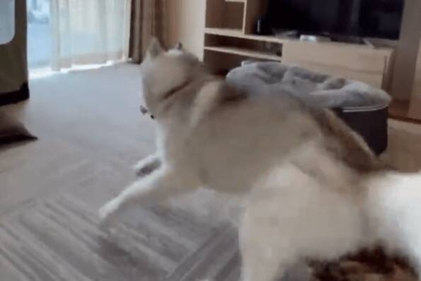 「おはようございモフ」「朝からキレッキレのハスキー犬」というツイートともに投稿されたのは、飼い主が犬と戯れる動画です。