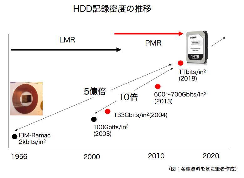それでも、記録密度はPMRで1Tビット/平方インチ、PMRとSMRの併用では1.4Tビット/平方インチが狙える。しかし、市販されているHDD(PMR&SMR)の記録密度はすでに1Tビットを超えており、既存技術での高密度化が頭打ちになるのは時間の問題だ。