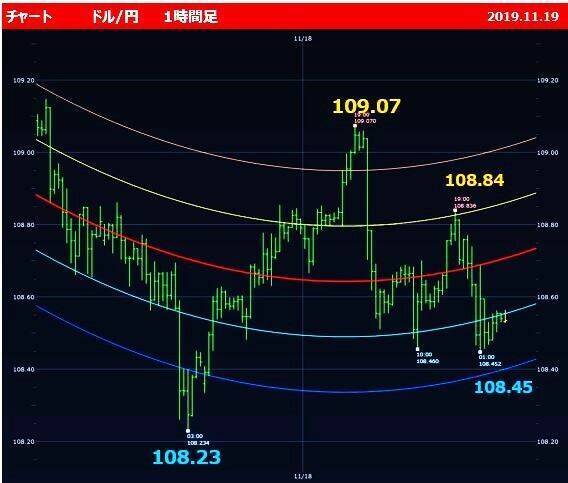 週明けに109円台にのせて、109.07円まで上げたドル/円ですが、米中貿易交渉の合意期待が後退するとともに勢いを失い、この日(19日)の高値は108.84円まで。NY時間には108.45円まで下げています。