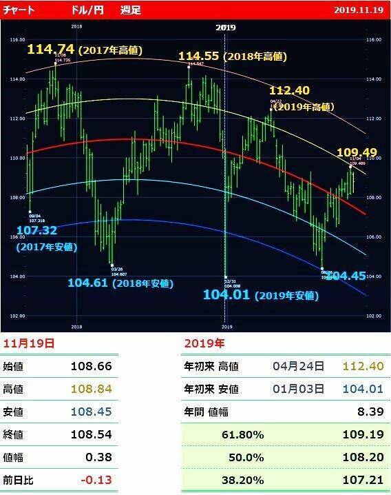 19日(月曜)の終値は108.54円。11月の中心値は108.69円(107.89円/109.49円)を下回ってきました。下向き勢力が徐々に優勢になっているという状況と考えますが、まだ円高モードにスイッチが切り替わったわけではありません。