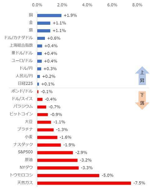 先週は、金属の上昇が目立ちました。銅が+1.9%、金が+1.1%、銀が+1.1%でした。上昇率自体は大きくはありませんが、金属がそろって上昇したことには、一定の意味があるとみられます。
