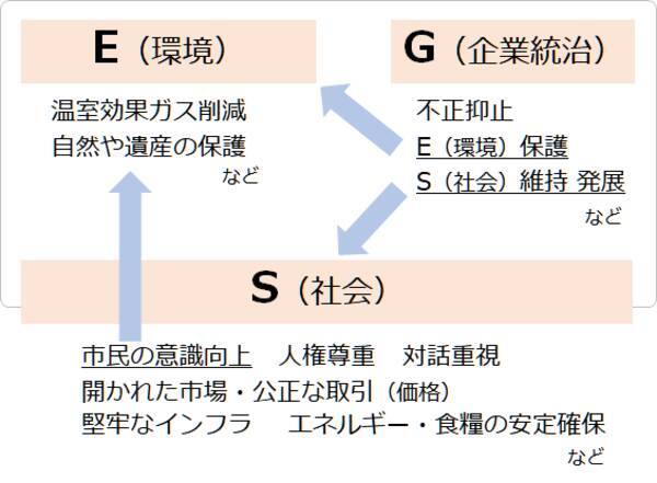 上図より、E(環境)とG(企業統治)はS(社会)の一部であること、GとSの一部はEを維持・改善させる直接的な影響力を持っていることが分かります。