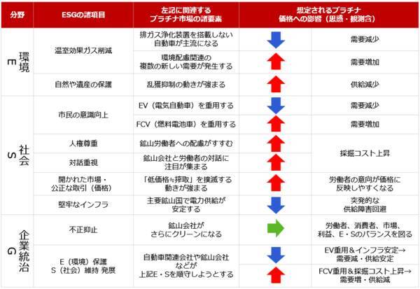 このようなESGの全体像を踏まえ、ESGとプラチナ市場の関連を考察します。以下は、ESGにおける諸項目と関わりが深いプラチナ市場におけるさまざまな要素と、それらから受け得るプラチナ価格への影響です。