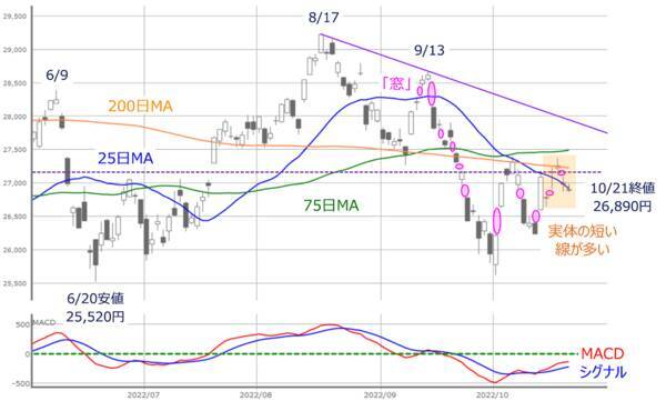 図1 日経平均(日足)とMACDの動き (2022年10月21日取引終了時点)
