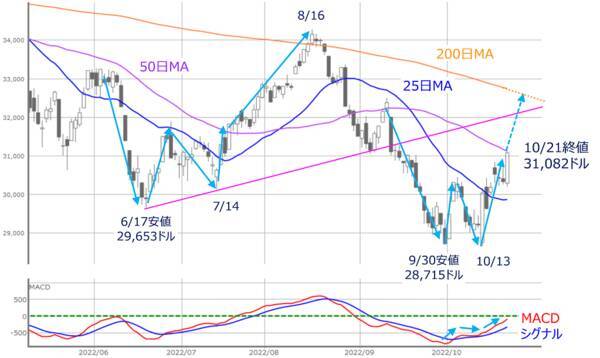 図2 米NYダウ(日足)とMACDの動き (2022年10月21日取引終了時点)