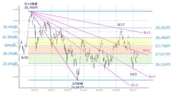 図4 日経平均(日足)の水準感と方向感(2022年10月14日取引終了時点)
