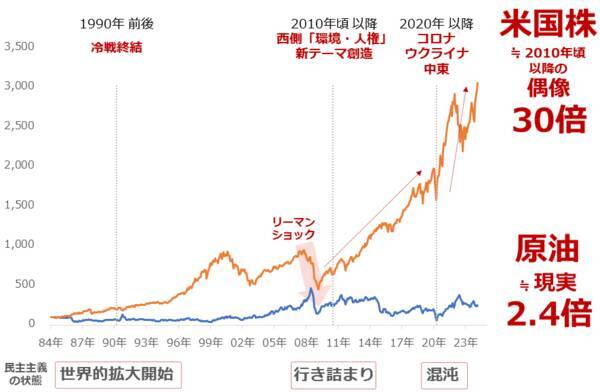 1984年1月比で2.4倍の原油(≒現実)と同30倍の米国株(≒偶像)の値動きに差が生じ始めたのが、リーマンショック(2008年)後でした。先ほどのグラフに書いた通り、世界全体で民主主義が行き詰まりを見せはじめた時期からです。