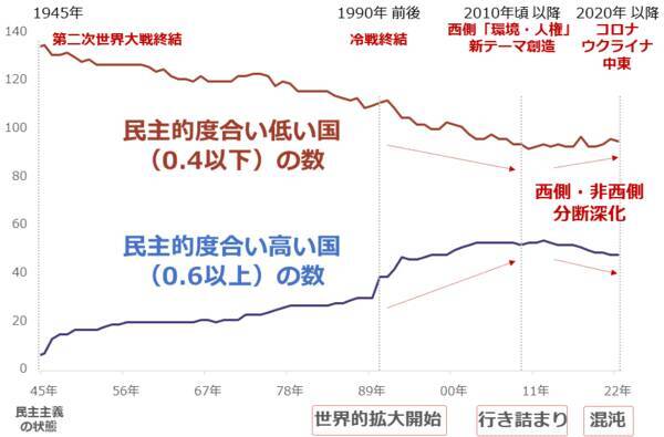 図:自由民主主義指数0.4以下および0.6以上の国の数(1945年~2022年)