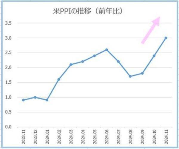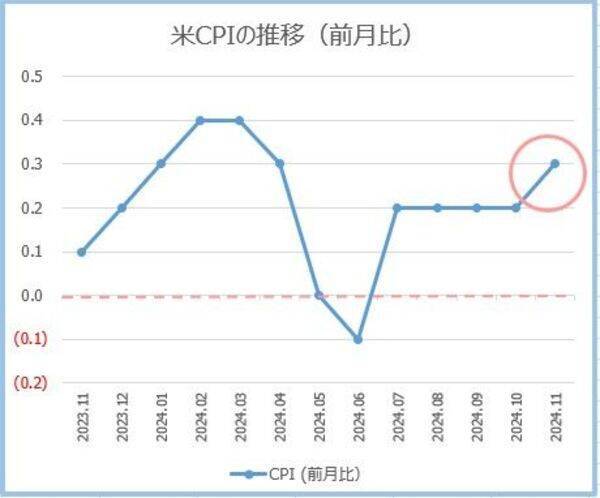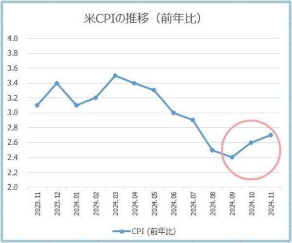 11月のCPI(米消費者物価指数)は、前年同月比で2.7%上昇した。前月の2.6%から0.1ポイント加速し、2カ月連続で上昇した。前月比では0.3%上昇して7ヵ月ぶりの上昇。変動の大きい食品とエネルギーを除いたコアCPIは、前年同月比で3.3%上昇、前月比では0.3%上昇した。今年のCPIを押し下げていた新車・中古車価格は上昇に転じた。中古車価格は2%上昇した。
