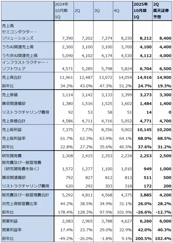●ブロードコムの2025年10月期1Qは、24.7%増収、営業利益3.01倍。特注型AI半導体が好調。●今2Qの会社側売上高ガイダンスは、前年比19.3%増の149億ドル。AI関連売上高は今1Q41億...