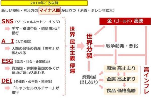 人類が良かれと思って生み出した技術や考え方が「行き過ぎて」しまい、マイナス面が目立ってしまいました。それにより、世界の民主主義が停滞→世界分裂が目立つ→資源国が出し渋り→資源価格が高騰→長期視点の高インフレ発生、そしてそのインフレが世界分裂に拍車をかけている、と考えられます。