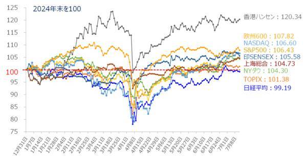 <図3>世界の主要株価指数のパフォーマンス比較(2024年末を100)(2025年7月11日時点)