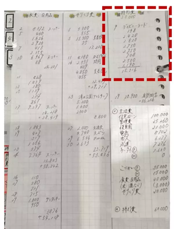 ↑2022年4月のえまさん宅の、紙ベースの家計簿。「食費・日用品」と「やりくり費」と「特別費」の三つで支出をまとめていた。