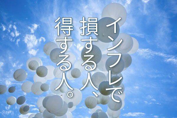 損をするのは、現金・預金を保有している人です。利子がほとんどつかない中で、物価が10%上昇すると、預金の価値は実質10%目減りします。それでは、誰が得をするのでしょう? 得をするのは、借金をしている人です。借金の価値が実質10%目減りするからです。日本で最大の借金主は「日本国」です。