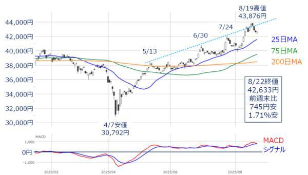 先週末8月22日(金)の日経平均株価は4万2,633円で取引を終え、前週末比で745円安(1.71%安)、週間ベースで3週ぶりの反落となりました。