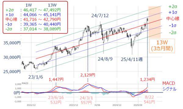 反対に、下落して行った場合でも、株価が中心線より上をキープしている限り、相場の強気ムードが続くことになります。ちなみに、現時点の中心線は4万1,716円です。