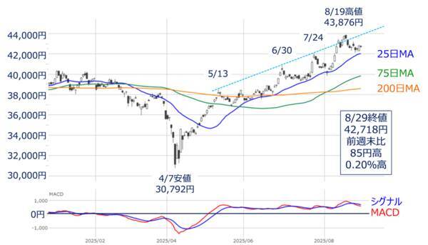 <図2>日経平均(日足)とMACDの動き(2025年8月29日時点)