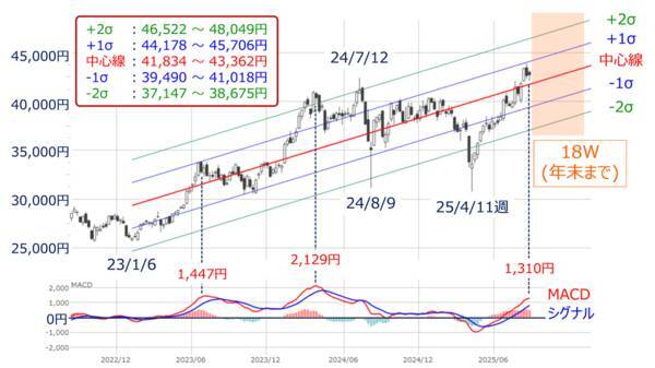 もし、今後の株価が中心線を下抜けてしまった場合には、マイナス1σの3万9,490円が意識されることになり、株価の攻防戦の水準が4万2,000円台から4万円台へと一段階引き下げられることになります。